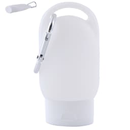 - White plastic squeeze bottle with silver carabiner for easy attachment.